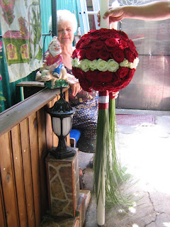 Nasii au ales o pereche de lumanari elegante si somptuase din trandafiri albi si rosii pe sfera cu terminatii din steel grass legat cu satin rosu grena si alb - lumanarile au 1,50cm iar sfera cuprinde 103 trandafiri/bucata